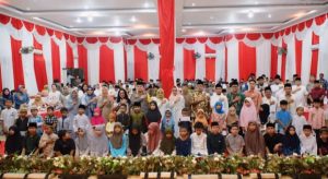 Keterangan fhoto : Plt Bupati Labuhanbatu Hj Ellya Rosa Siregar .S.Pd.MM.bersebelahan dengan Kapolres Labuhanbatu AKBP Dr. Bernhard L Malau SH, SIK Poto bersama dengan para anak yatim piatu saat berbuka puasa di Mapolres Labuhanbatu