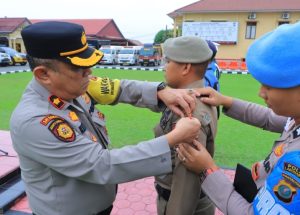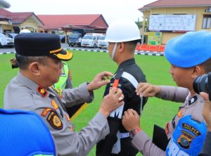 Keterangan fhoto : Waka polres Labuhanbatu Kompol Hendri Matondang, S.H., M.H.saat menyematkan tanda Porsenil pengamanan dan pelayanan masyarakat di hari raya idul Fitri 1445 H.