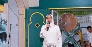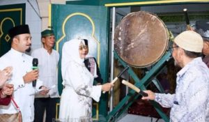 Keterangan fhoto : Plt Bupati Labuhanbatu Hj Ellya Rosa Siregar ,S.Pd,MM,di dampingi oleh pengurus BKM masjid Agung H Sammasri SH.MH dan para panitia pelaksanaan Festival Gema Taqbir pemuda Nasution saat memukul bedul tanda di mulai kegiatan