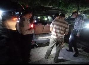 Keterangan fhoto : Kanit Binmas IPDA Hamdan Rivai bersama Tim Patroli yang lainya sedang memeriksa mobil yang di duga membawa barang terlarang