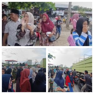 Keterangan Fhoto ; Kepala Sekolah SMP N 5 Bilah barat bersama guru dan murid sedang membagikan takjil kepada warga di pinggir jalan lintas depan petamini Desa Afd II bbilah barat